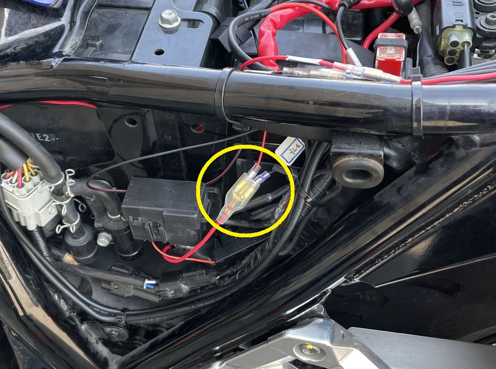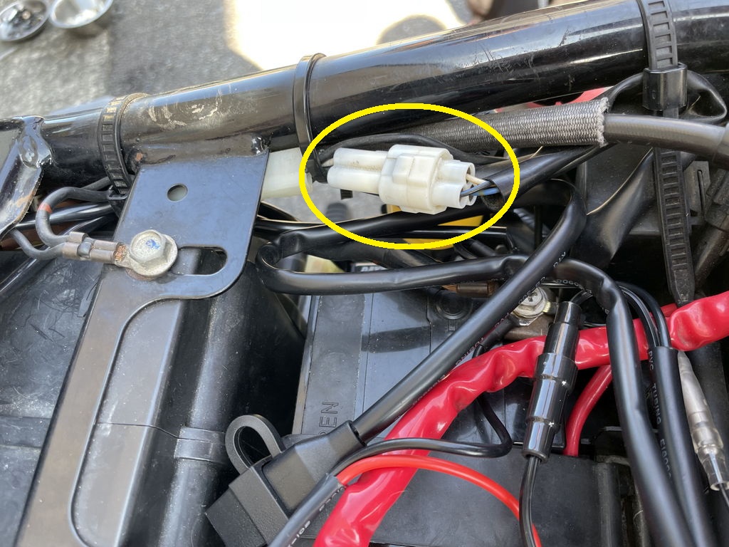 電源はACC(アクセサリ電源)から分岐させますが、砂井さんのXJR1300は既に分岐コネクターを付けているのでそのまま利用しました。