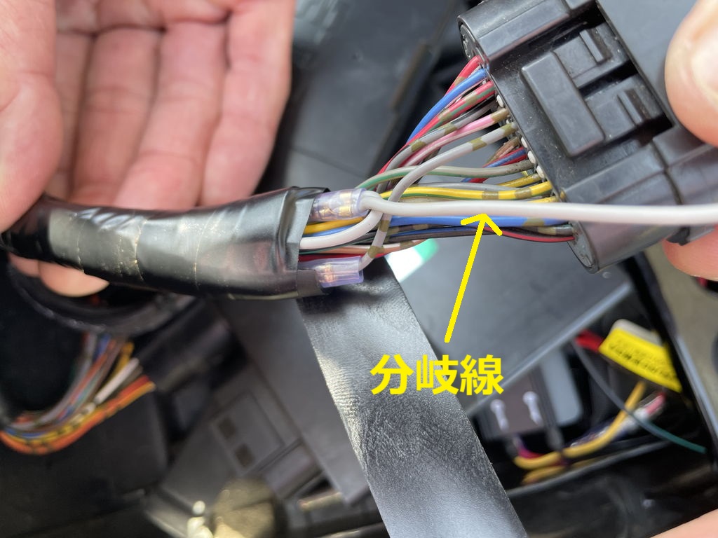 保護チューブを戻したら防水テープでグルグル巻きにし、追加した分岐線をシフトインジケーターの配線と繋ぎます。