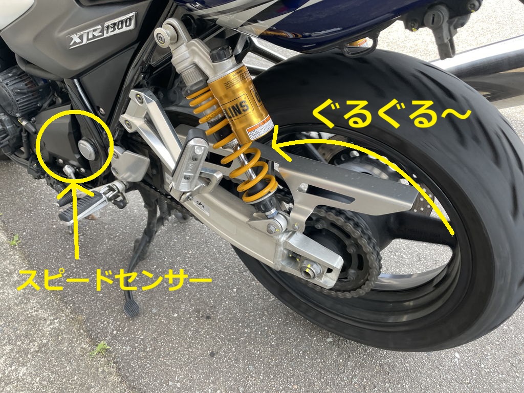 なので初期設定として実際に信号を学習させる必要があるんですが、後輪側(出力軸)にスピードセンサーがあるXJR1300はセンタースタンドで後輪を浮かせた状態から学習可能。