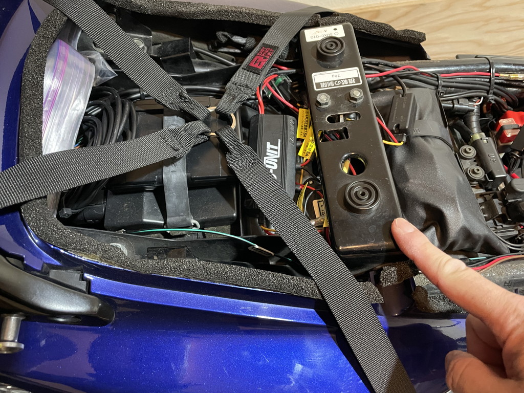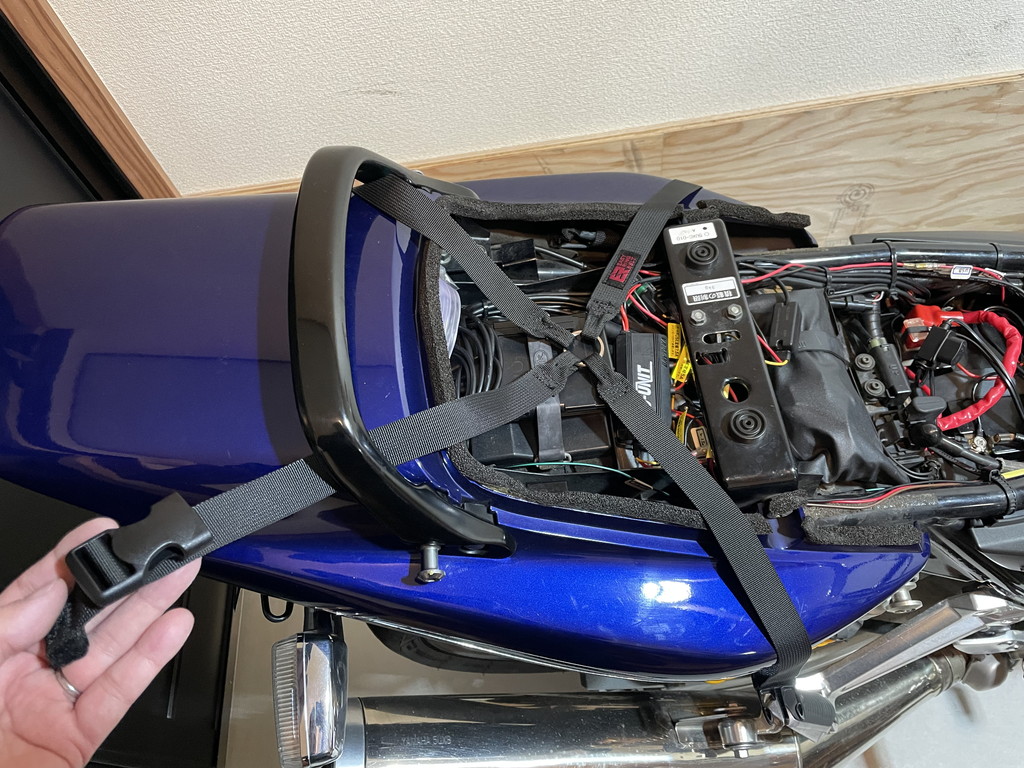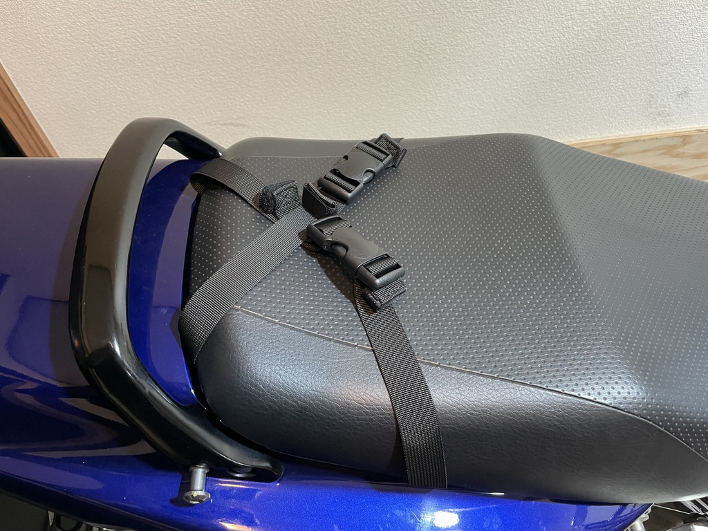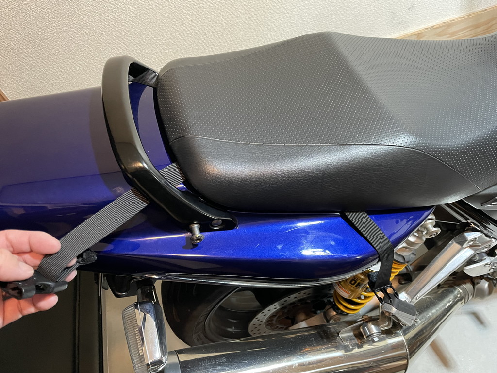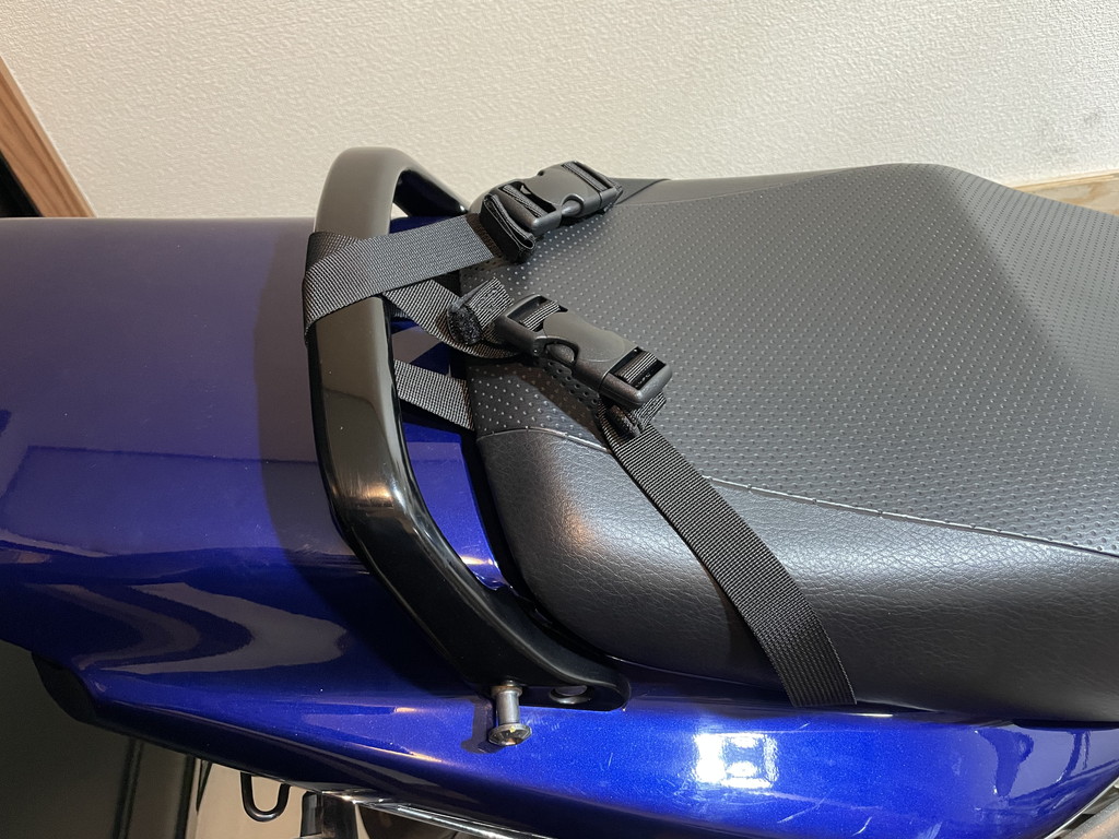 それなら位置の制約が無くなるので、イージーリングベルトの後方ベルトをグラブバーの下を通す方法を編み出しました。
