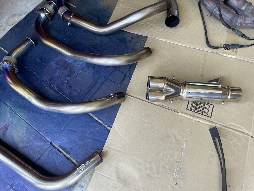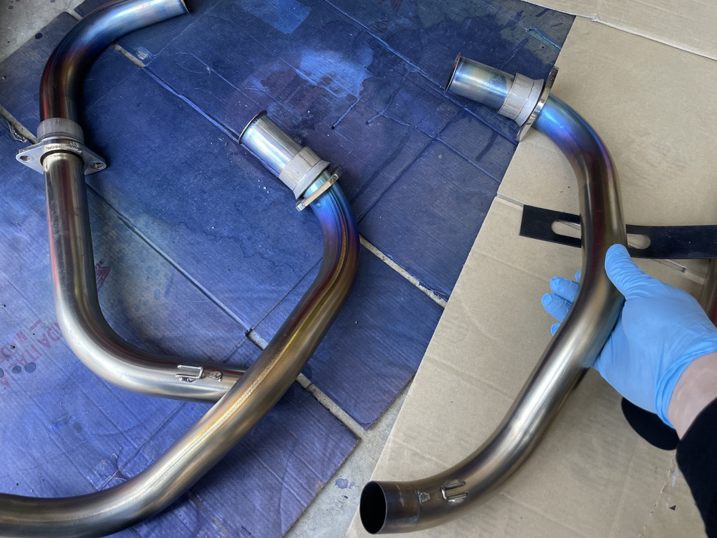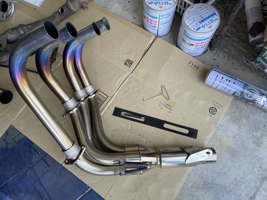 純正エキパイは4本一体構造でしたが、チタンサイクロンは各エキパイ、集合部、中間パイプの3分割構造です。