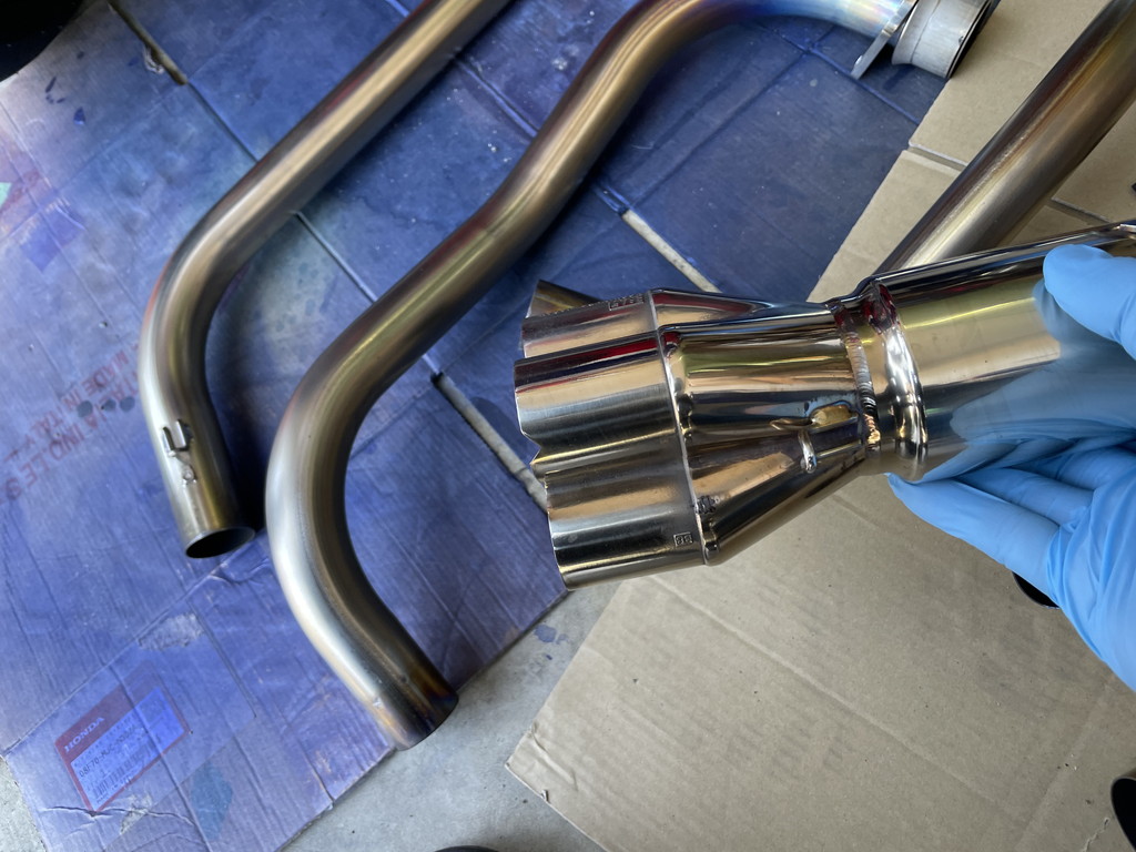 非常に重要な事ですが、皮脂が付着した状態で排気管に熱が入ると跡が焼き付いて悲惨な見た目になります。