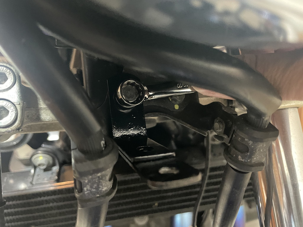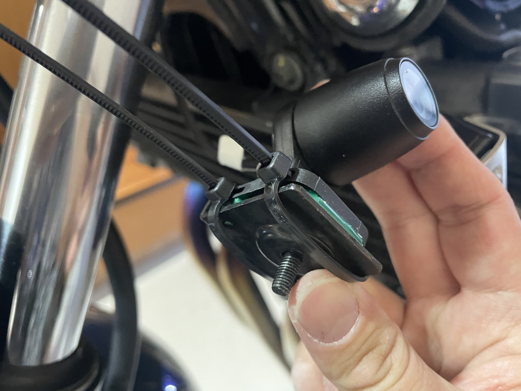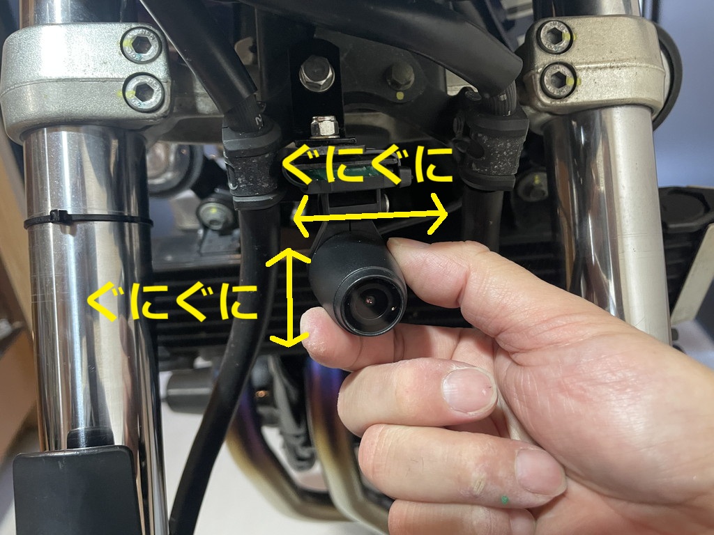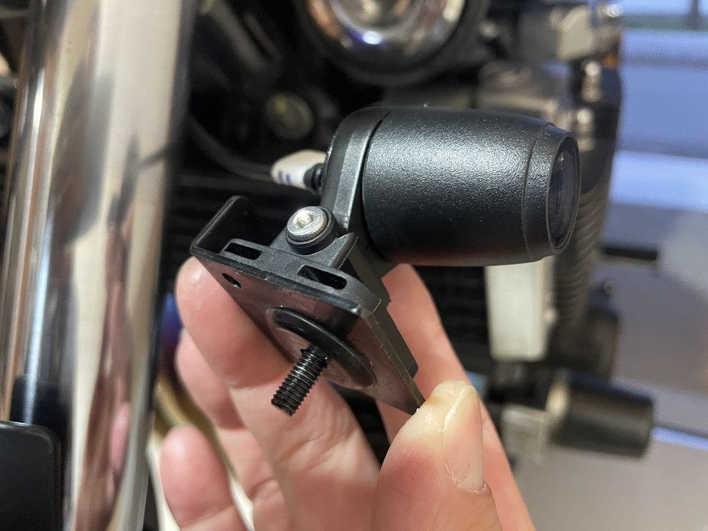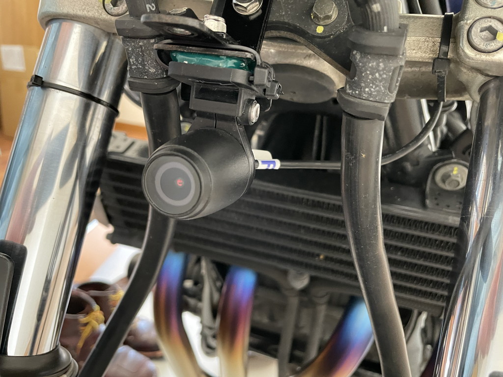 フロントカメラはヘッドライト下部に、ビキニカウル固定用ステーを介して取り付けられています。