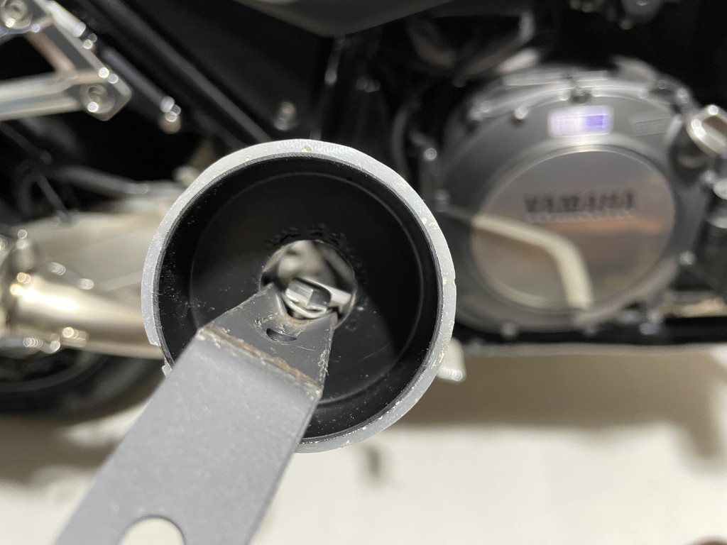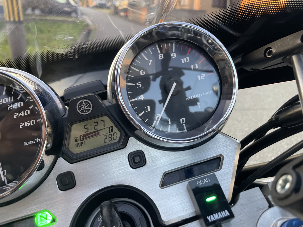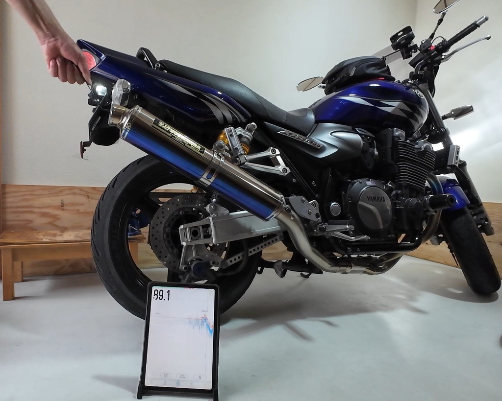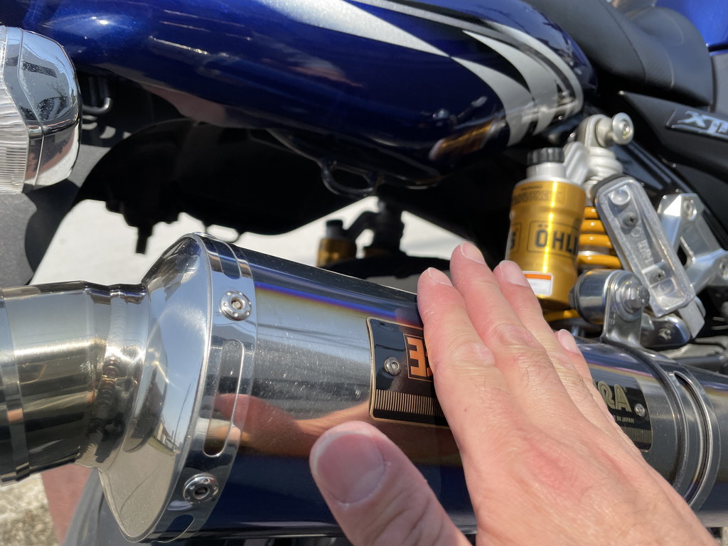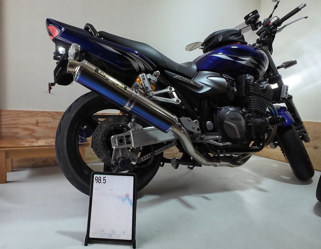 アイドリング(950rpmくらい)なら問題ないと思うチタンサイクロンの音量なんですが、このXJR1300はFI(Fuel Injection)車なので始動直後はアイドル回転数が上がります。