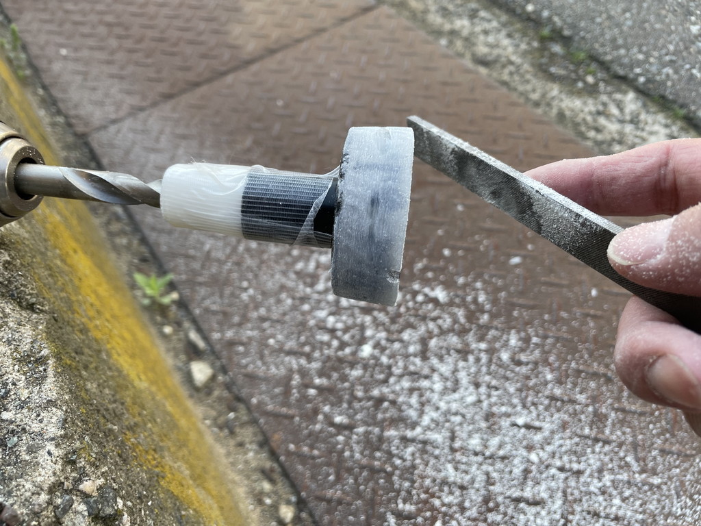 このなんちゃって簡易旋盤でエポキシ樹脂接着剤を成形していきます。