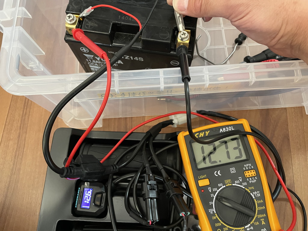 写真のテスターの他、車載の電圧計と比較すると、ENDURANCE製グリップヒーターの電圧計は0.1V程度低く表示している感じですが実用に問題はありません。。