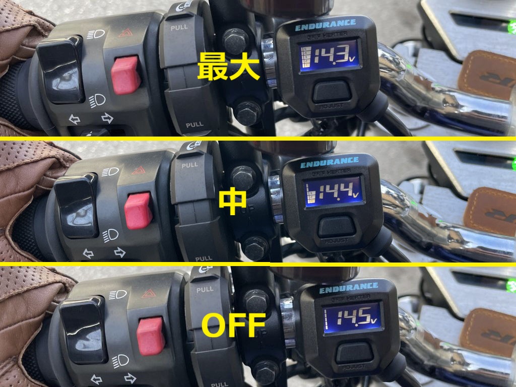 グリップヒーターを最大にすると14.3Vと、負荷は掛かっていますがバッテリー電圧を下回る事はありませんでした。