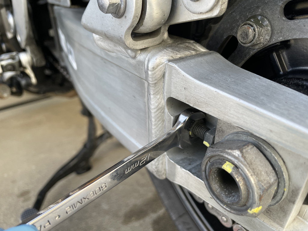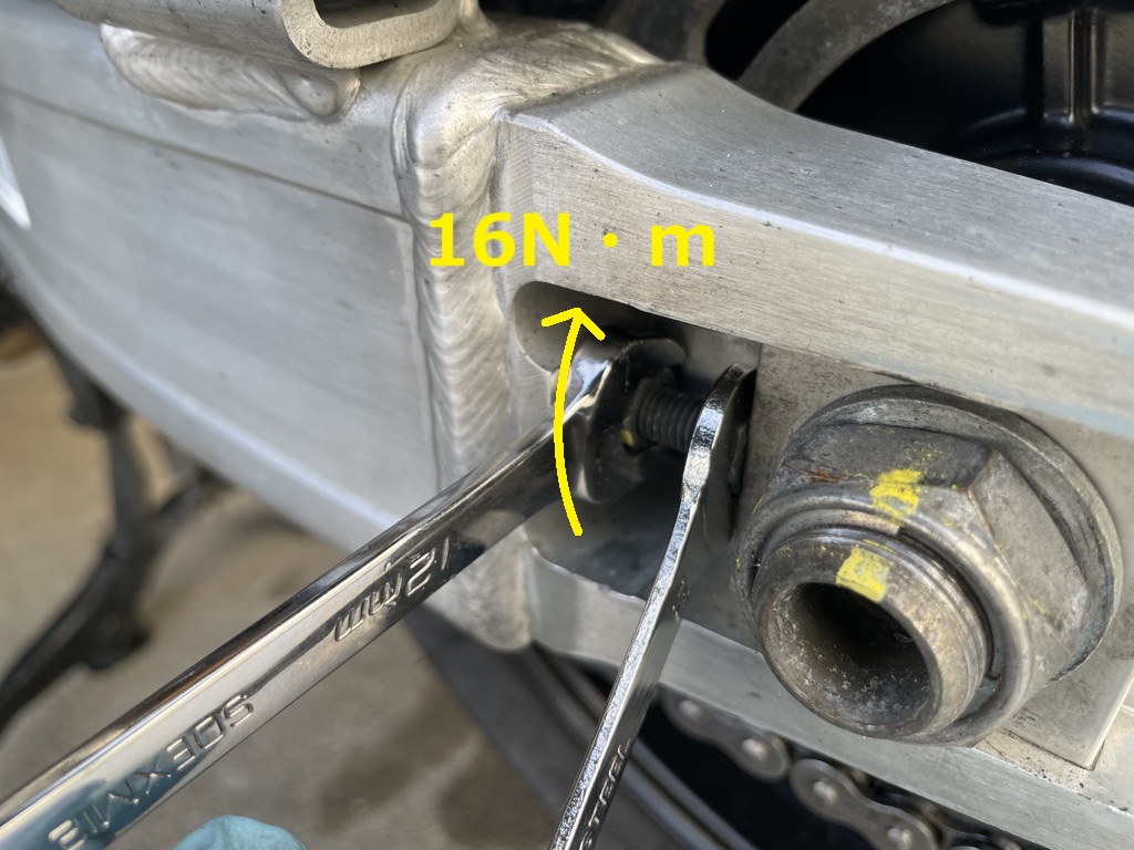 アジャスター(12mm)を伸ばし、チェーンのたるみが規定値内になるまで調整します。