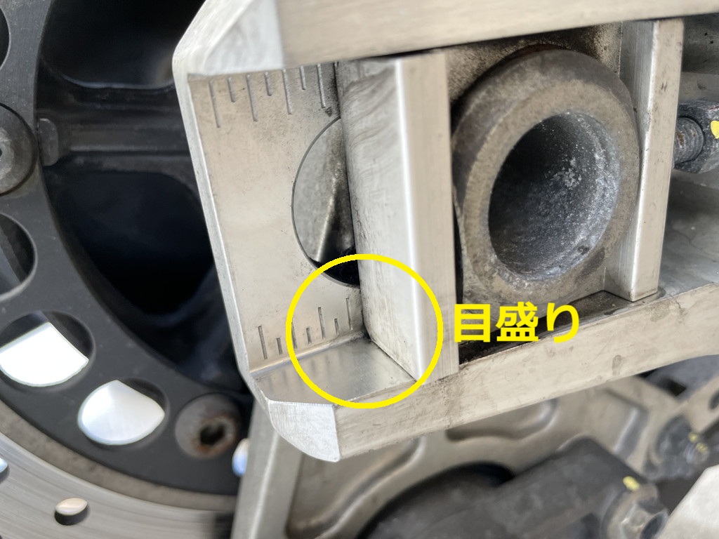 アクスル部に刻まれた目盛りを利用して、左右同じ位置になるように調整します。