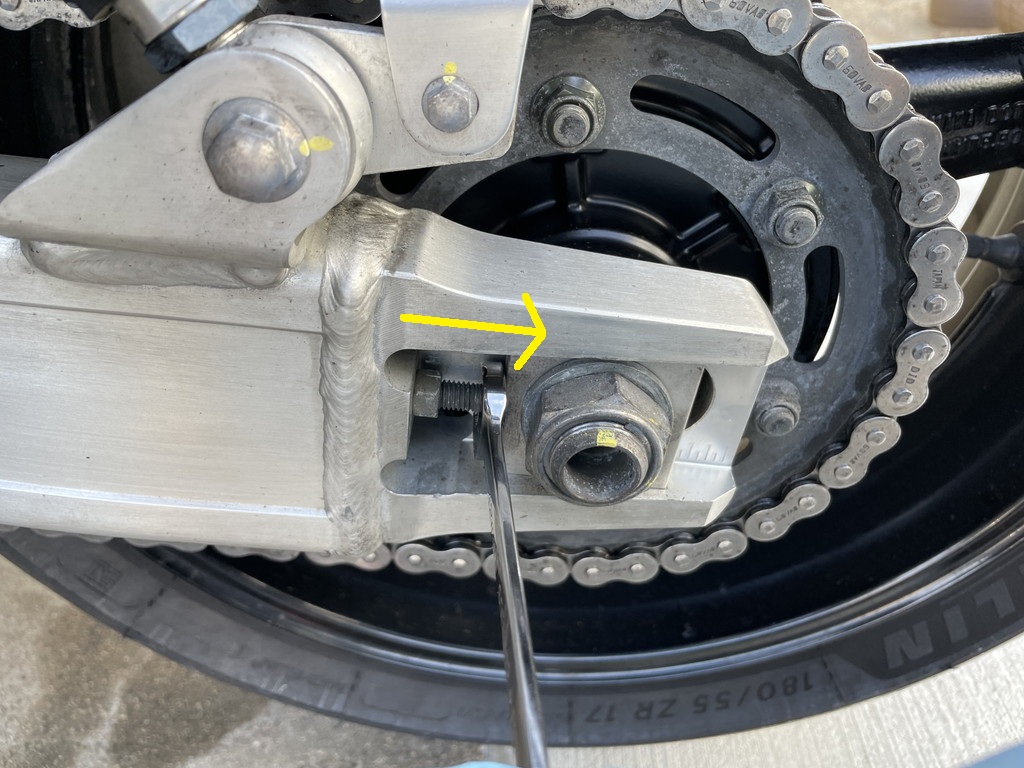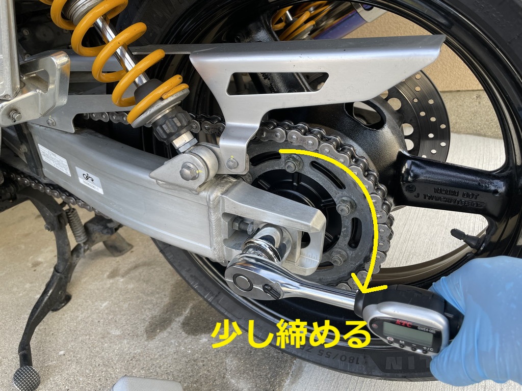 もし張り過ぎたらアジャスターを縮めてからロックナットを緩め、リアタイヤを押し込んでやり直します。