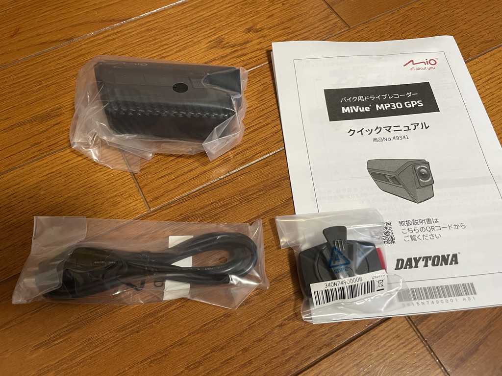 付属品はカメラ本体、ヘルメットマウント、専用充電ケーブル(Type-C)、取説です。