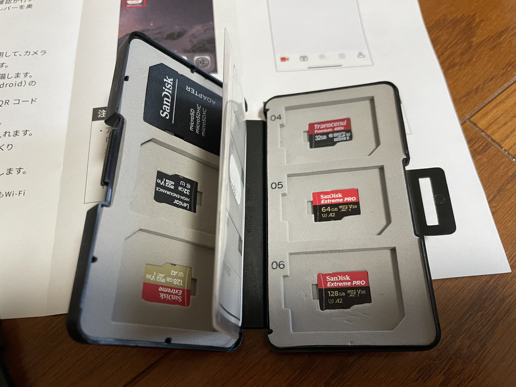 純正で64GBのSDカードが付属していますが、録画時間を延長したいので手持ちの128GBと交換しました。