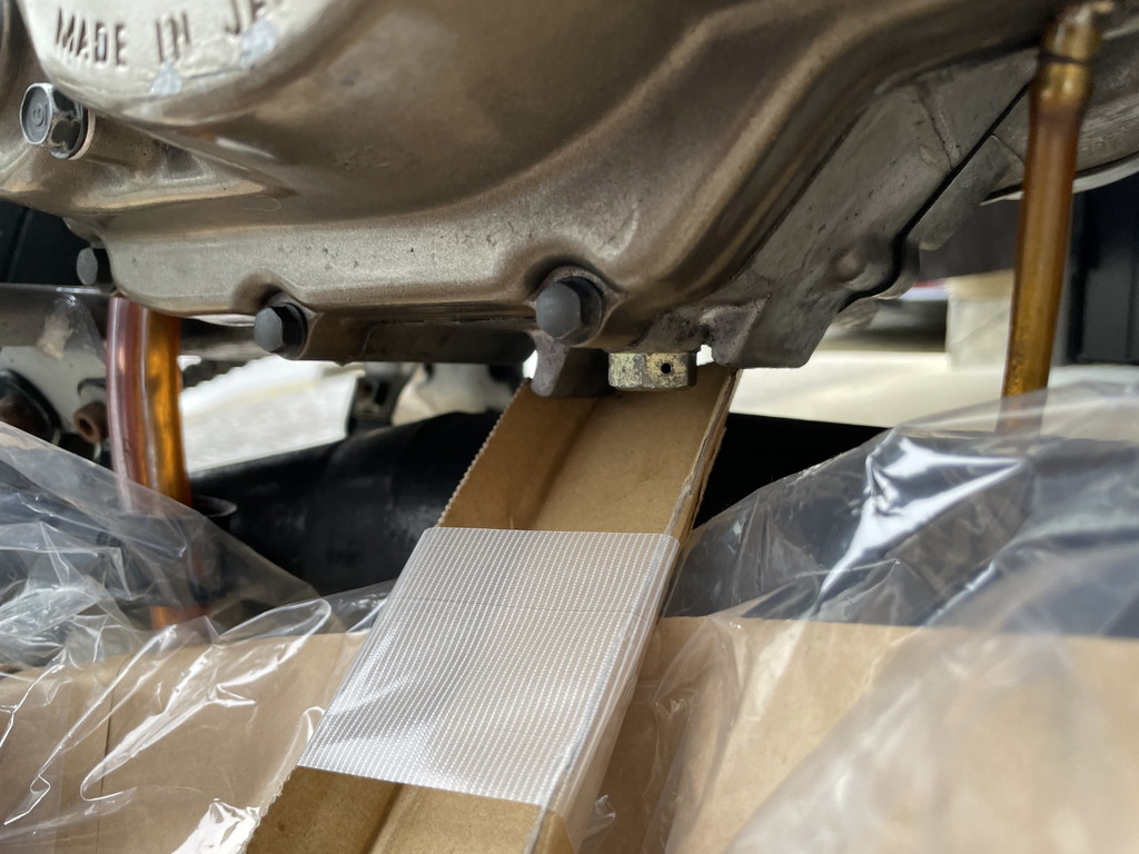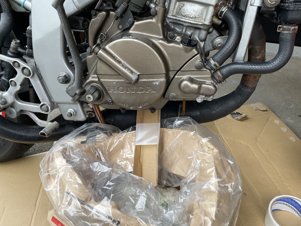 このNSR50はXJR1300とかと同じくオイルのドレン口の下にチャンバー(排気管)が来る構造なので、何も対策をしないとチャンバーがオイルで汚れます。