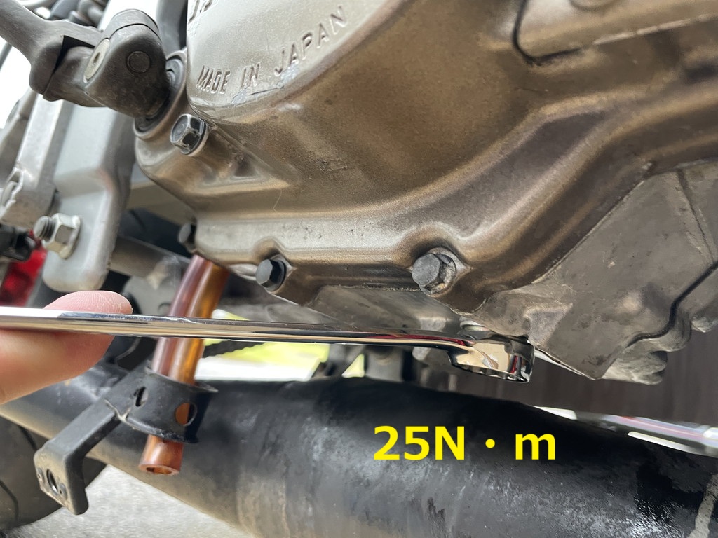 オイルが抜けたら2.5kg・m(約25M・m)でドレンボルトと締付け、パーツクリーナー等でキレイに洗浄します。