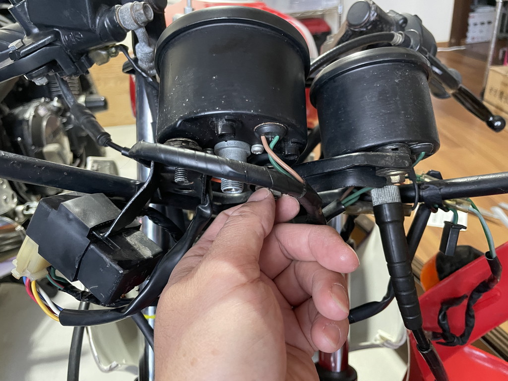 NSR50のフロントカウルを外し、タコメーターのケーブルを抜きます。