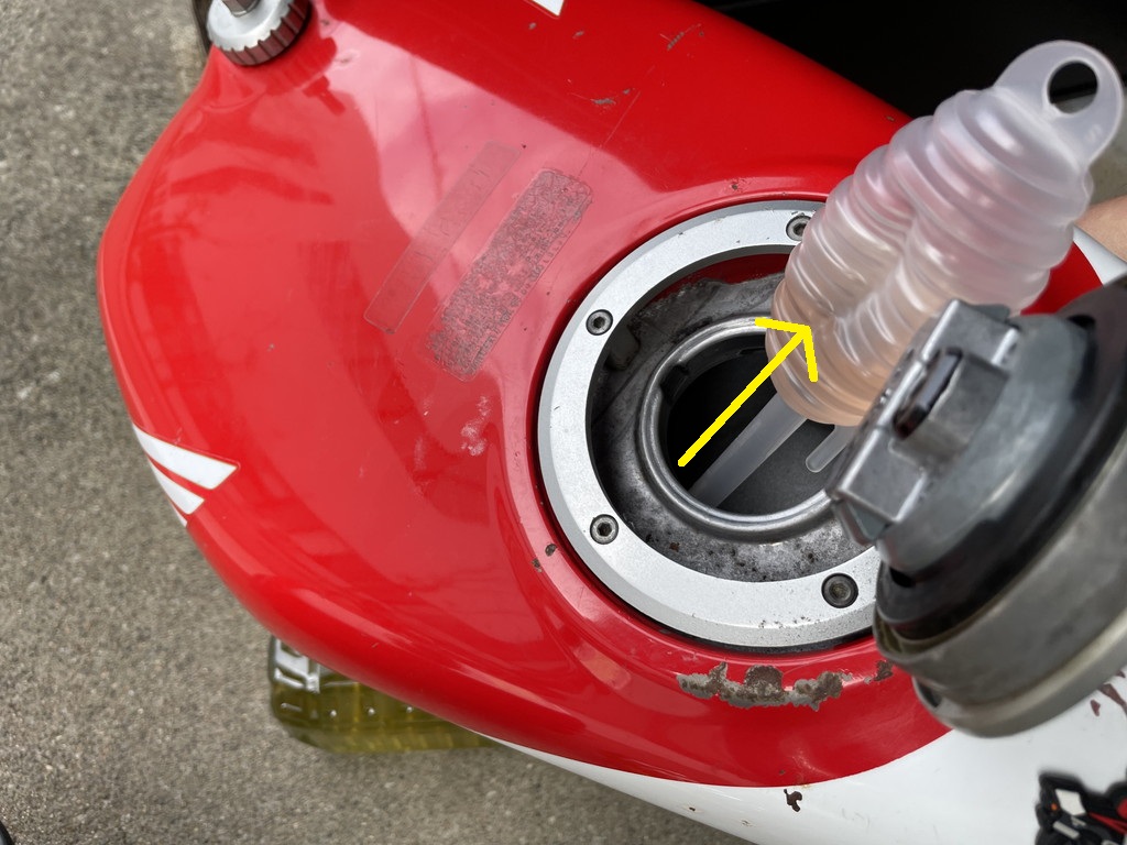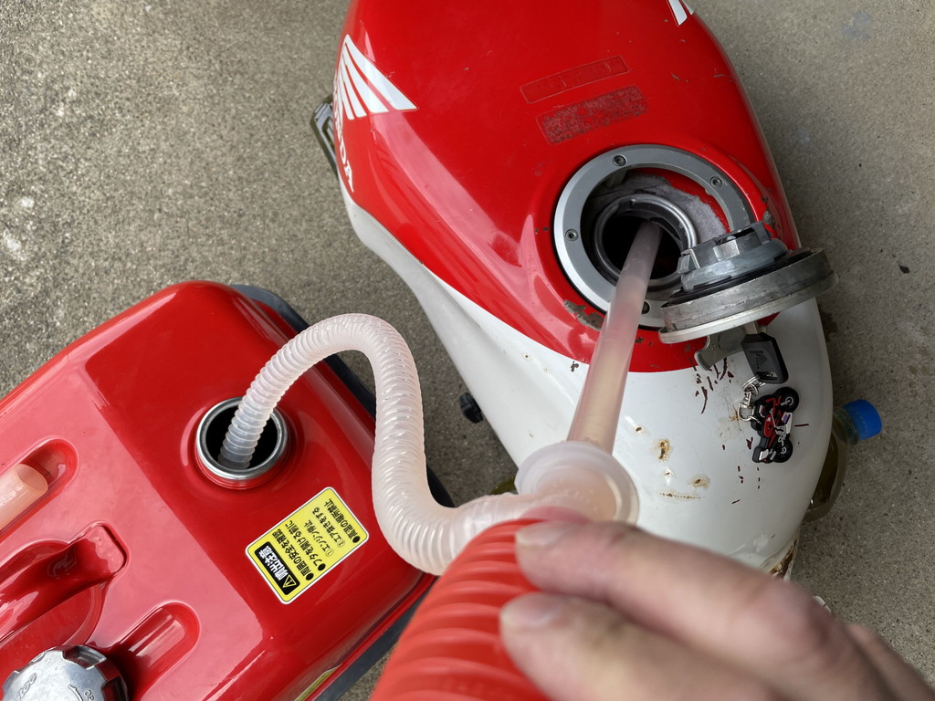 内部に残ったガソリンを醤油ちゅるちゅるで抜きます。