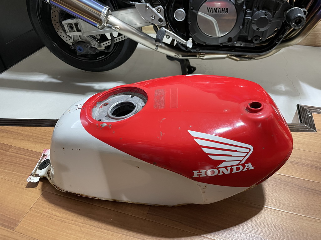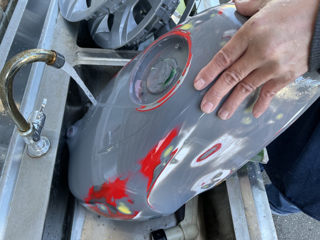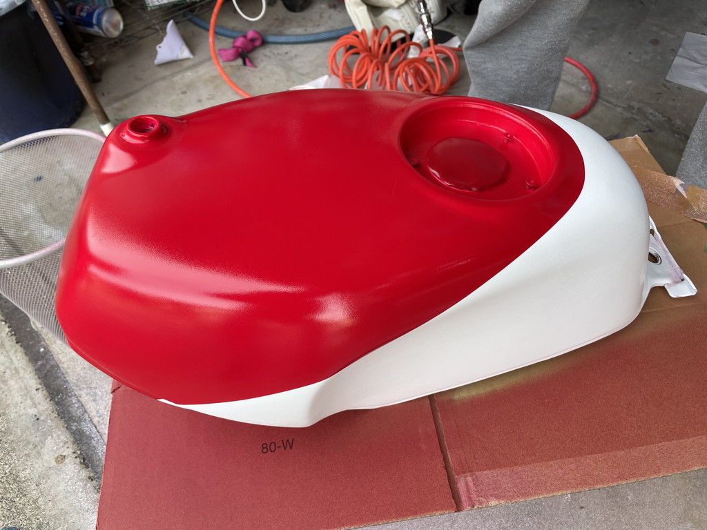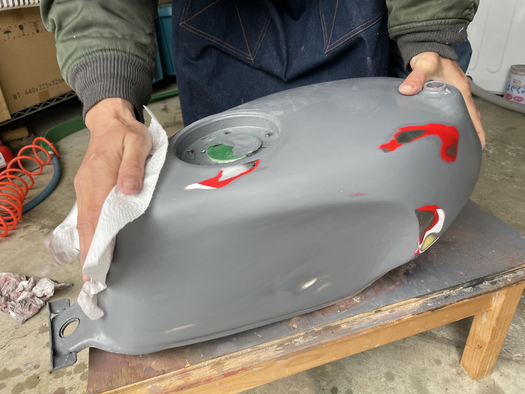 オリジナルのタンクは全体にレッドを塗ってあり、その上にホワイトが塗られていました。