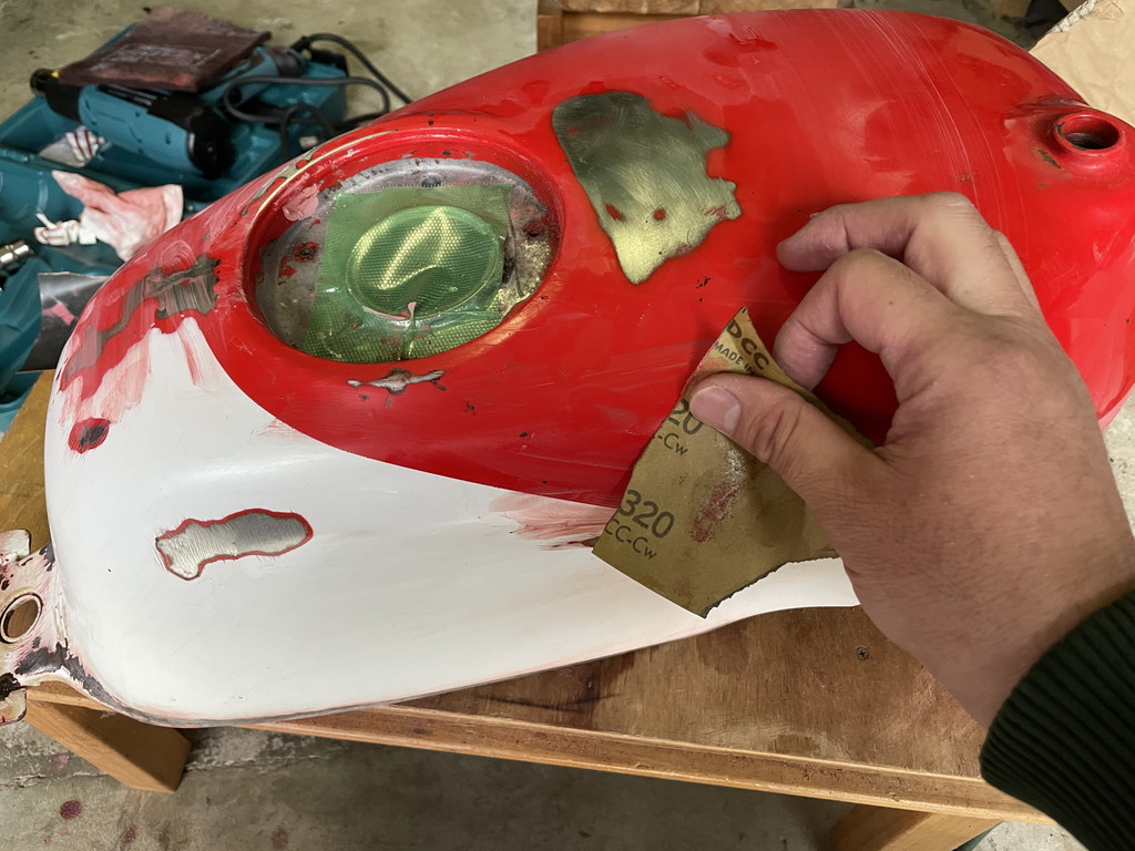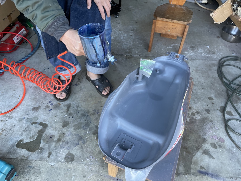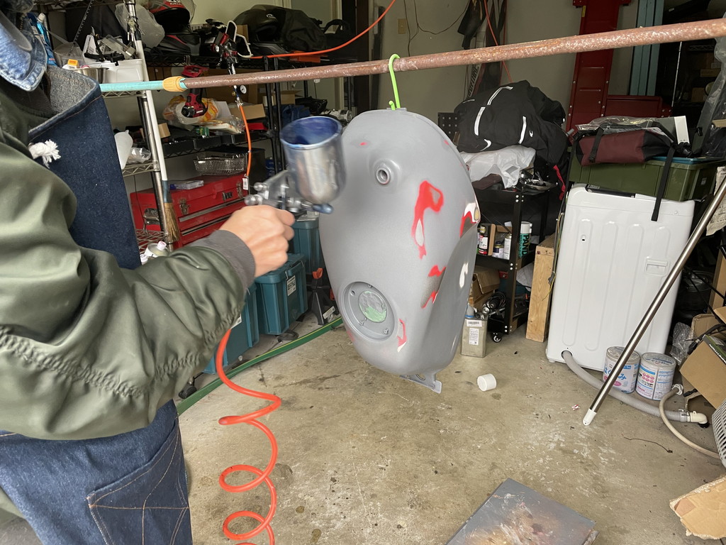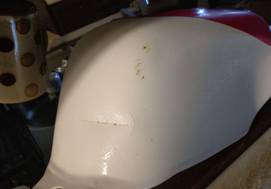 オリジナルのタンクは全体にレッドを塗ってあり、その上にホワイトが塗られていました。