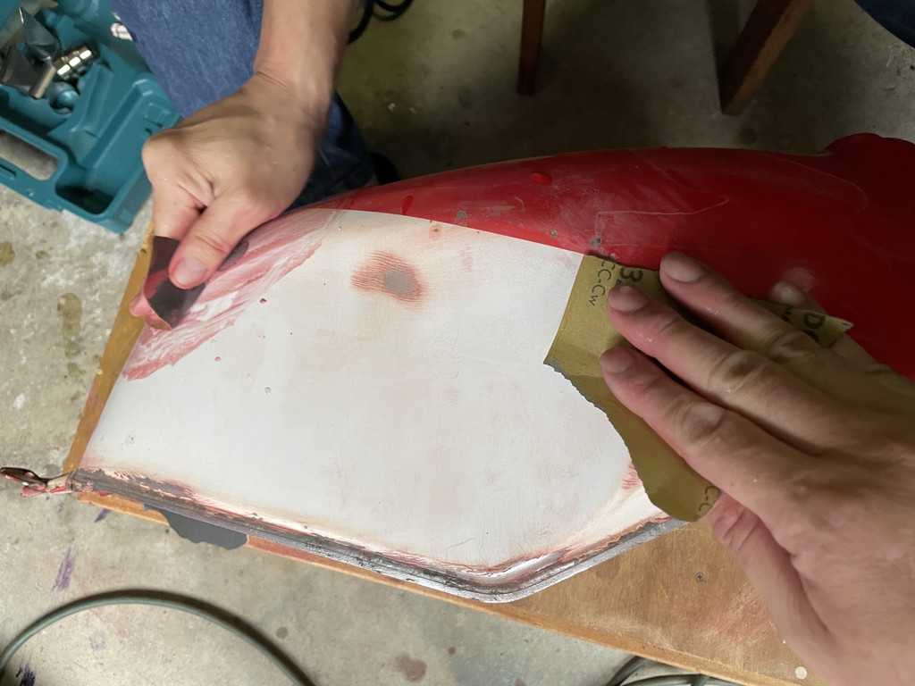 タンクの地金が出ているので数時間で錆てしまうと予想し、今回は後からパテ埋めする算段です。