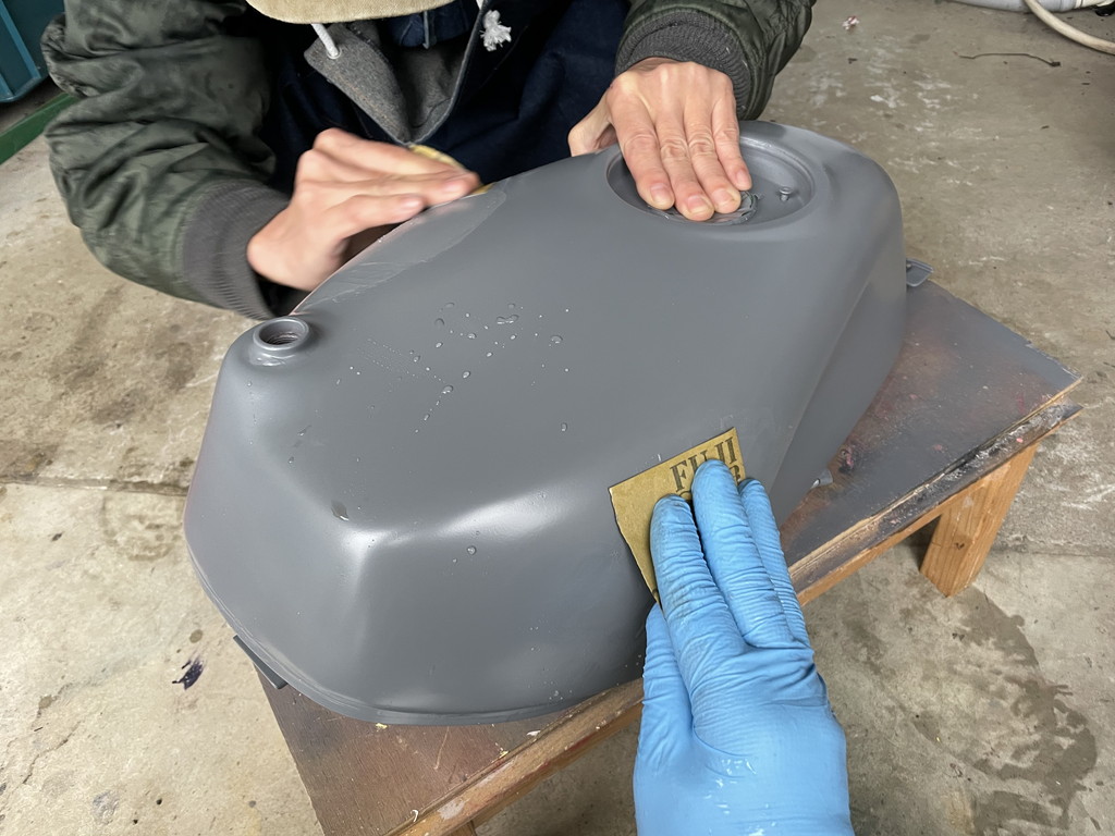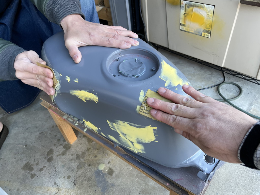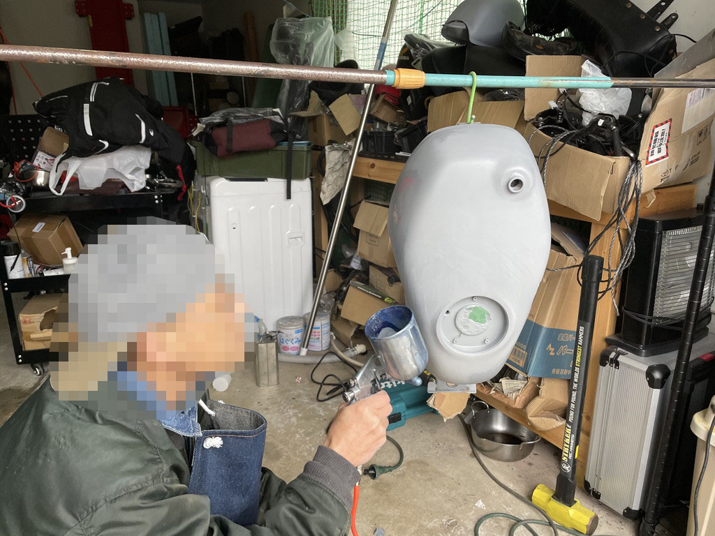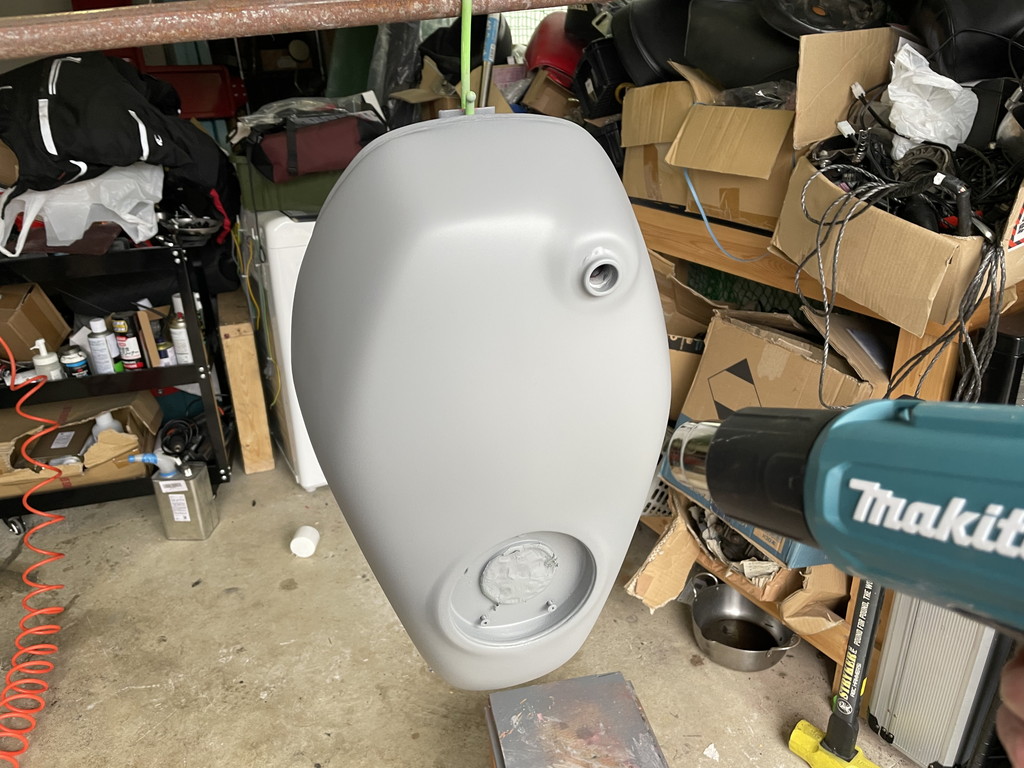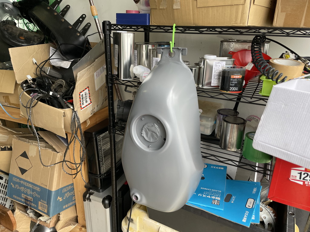 翌週に猫ガレージを訪れたら目の前にテキトーな感じにパテ盛りされたタンクがありました。