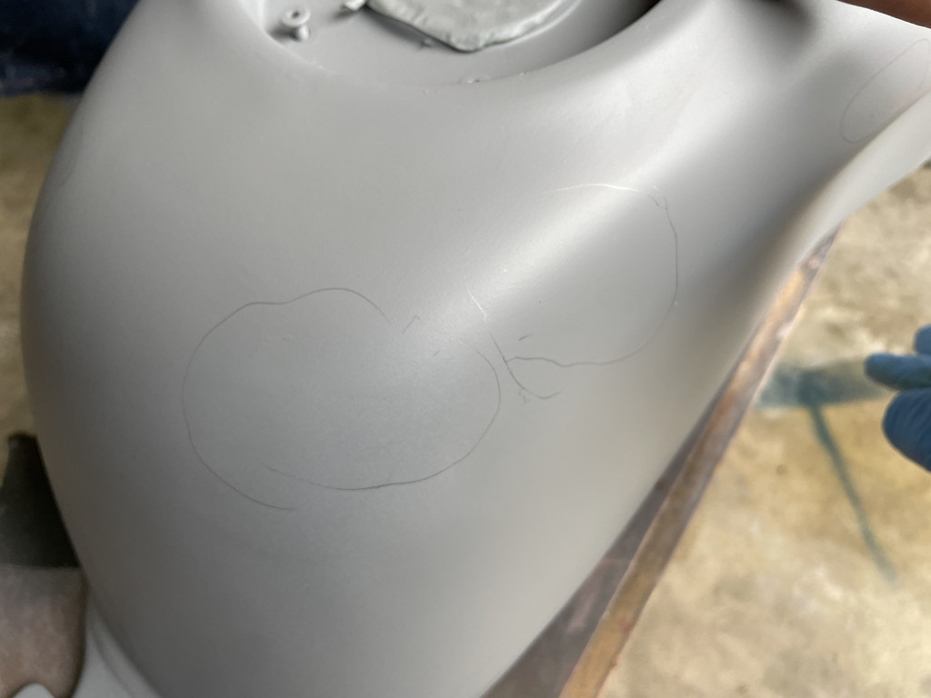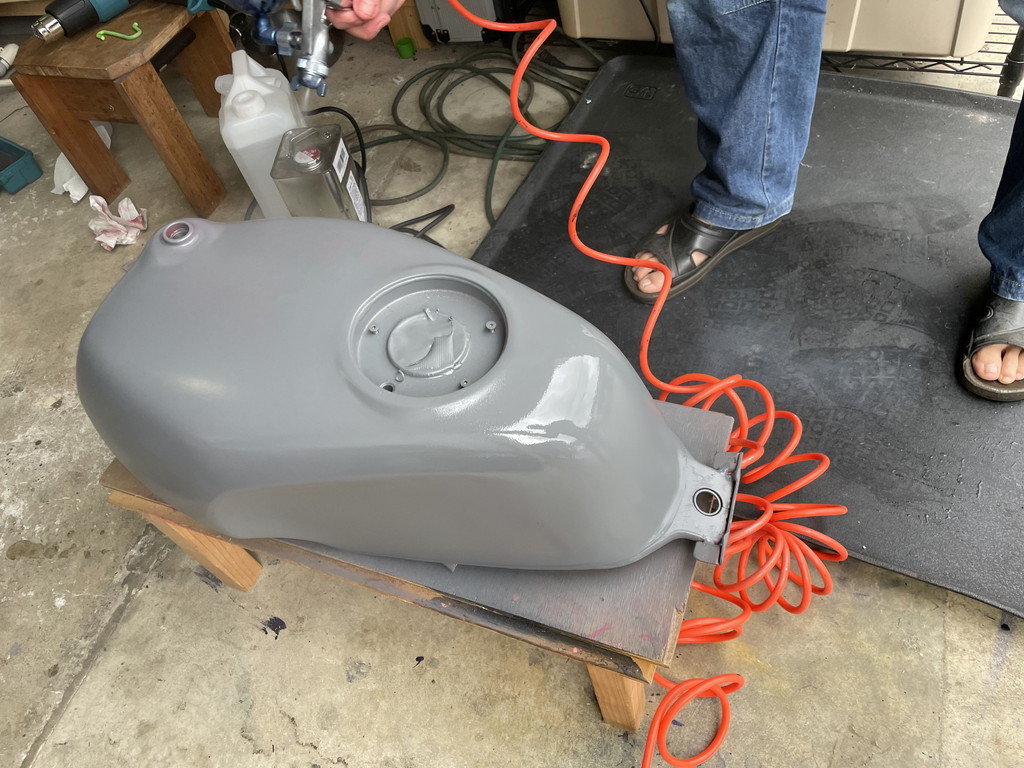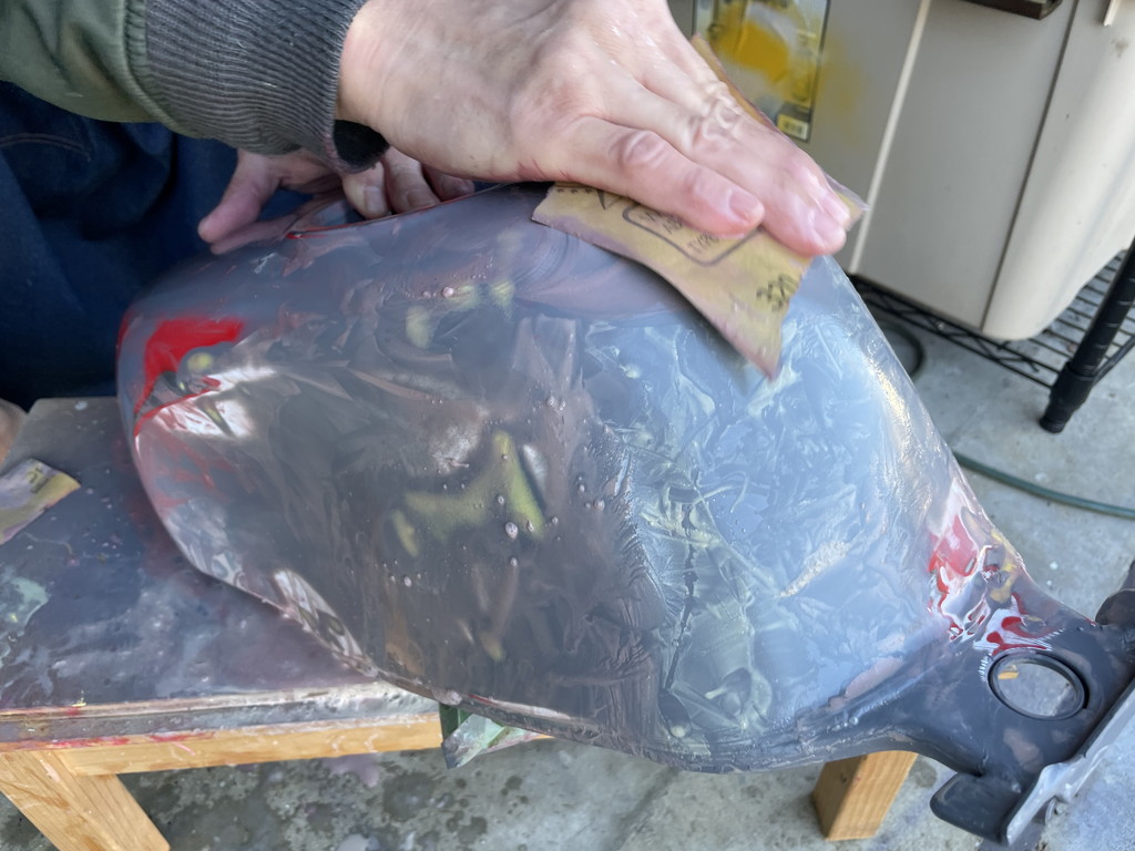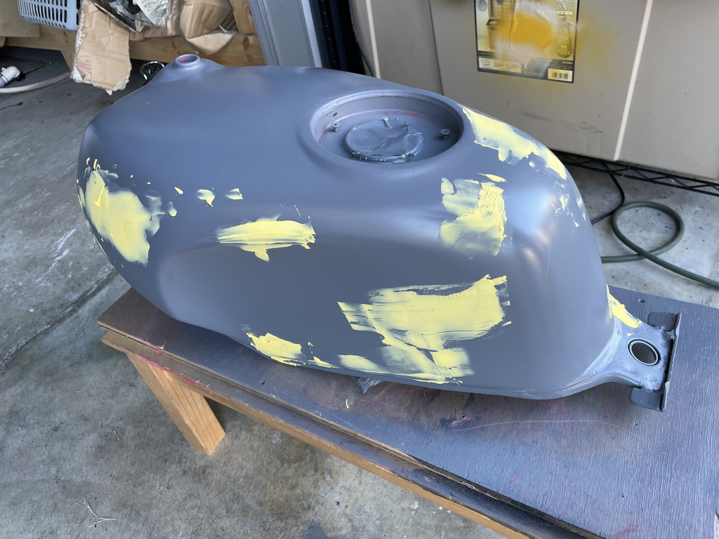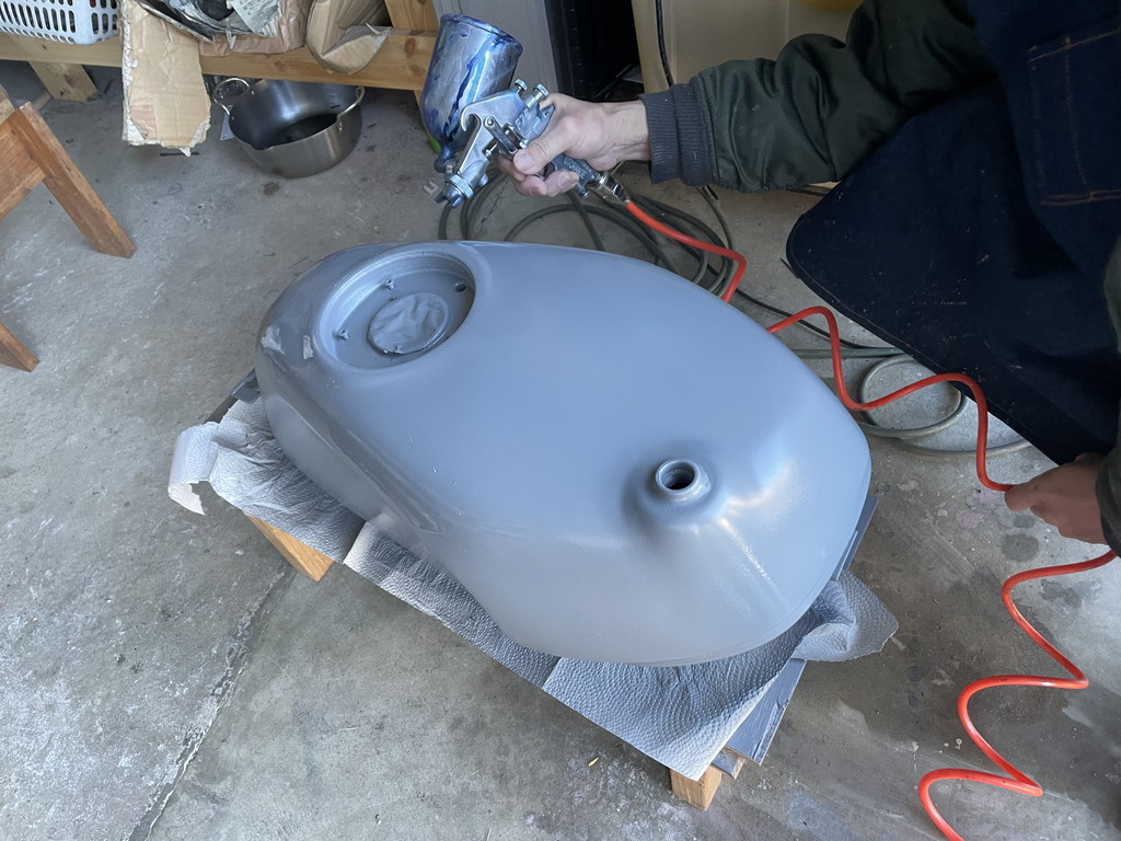 翌週に猫ガレージを訪れたら目の前にテキトーな感じにパテ盛りされたタンクがありました。