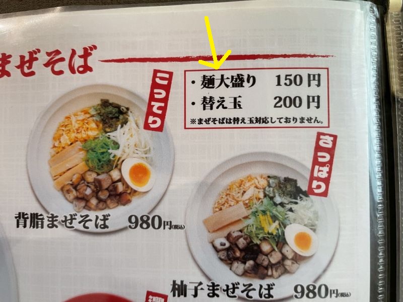 メインの炙りまぜそばは大盛りしか対応していませんが、ラーメンだと大盛りの他にも替玉が選べる方式です。