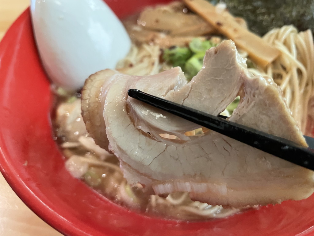 チャーシューは箸でつまむとホロホロと崩れるくらい柔らかい、少し薄めの味です。
