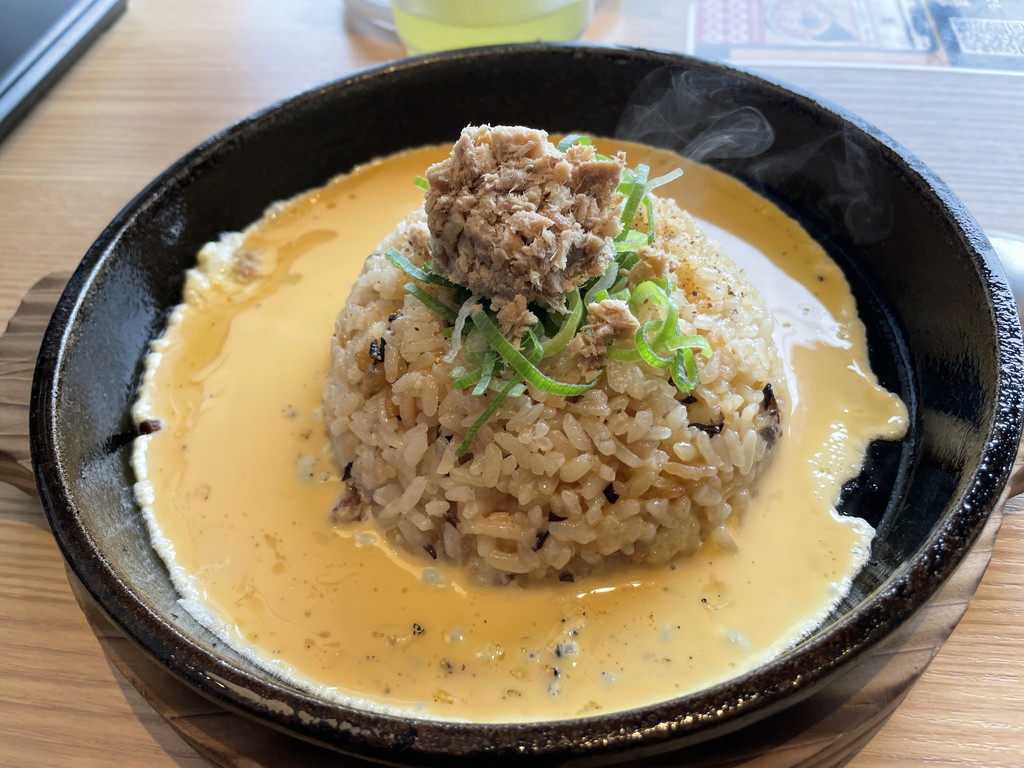 熱々の鉄板で提供され、お客さんの目の前で溶き卵をかけるスタイスです。