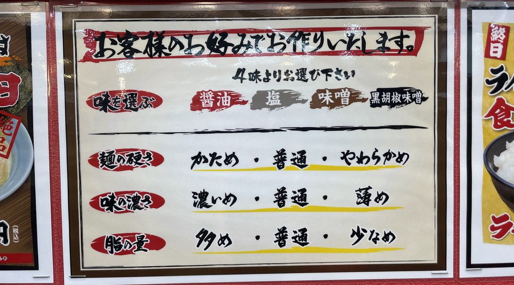 店員さんに食券を渡す時にお好みを伝えるのは共通。