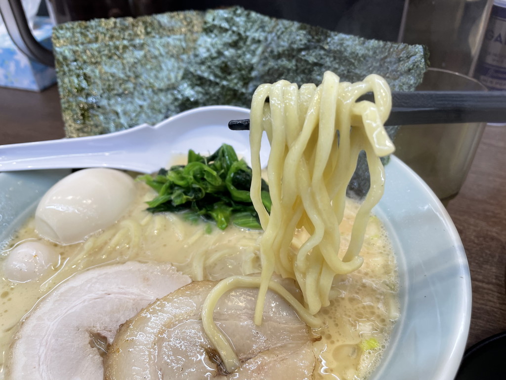 家系共通に太いくて平たい麺は程よい硬さとコシで美味しいですね。