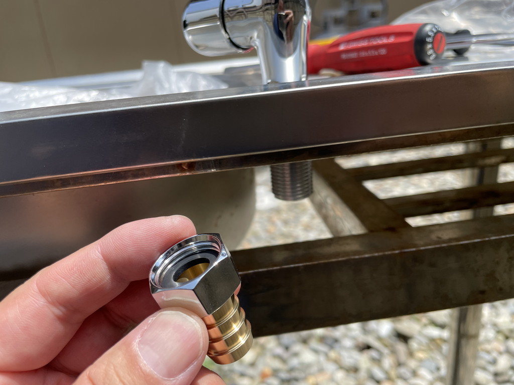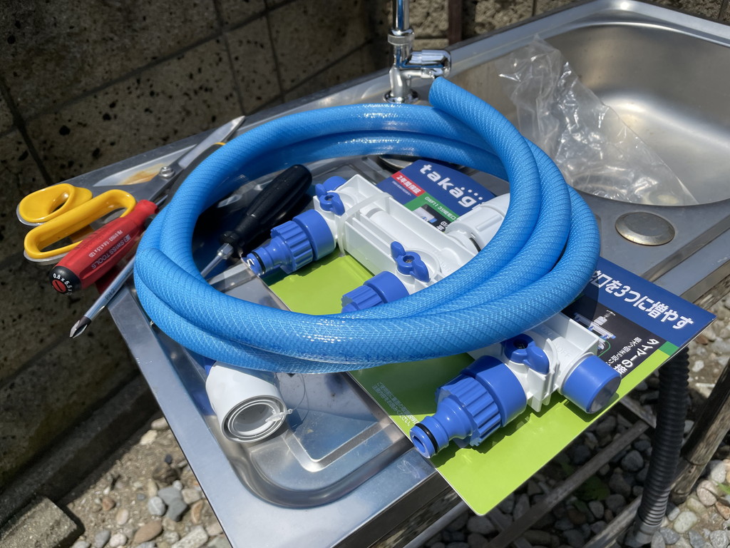 コレで散水用ホースリールとシンク、後で追加するガーデニング用ホースに分配出来るようにしたいと思います。