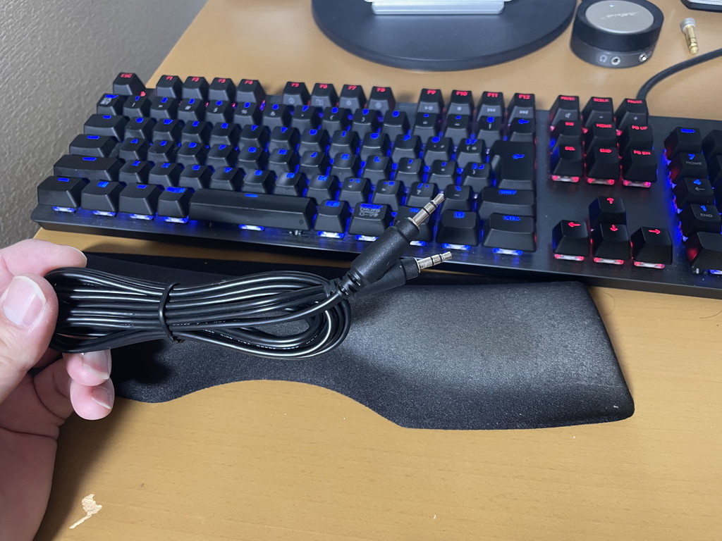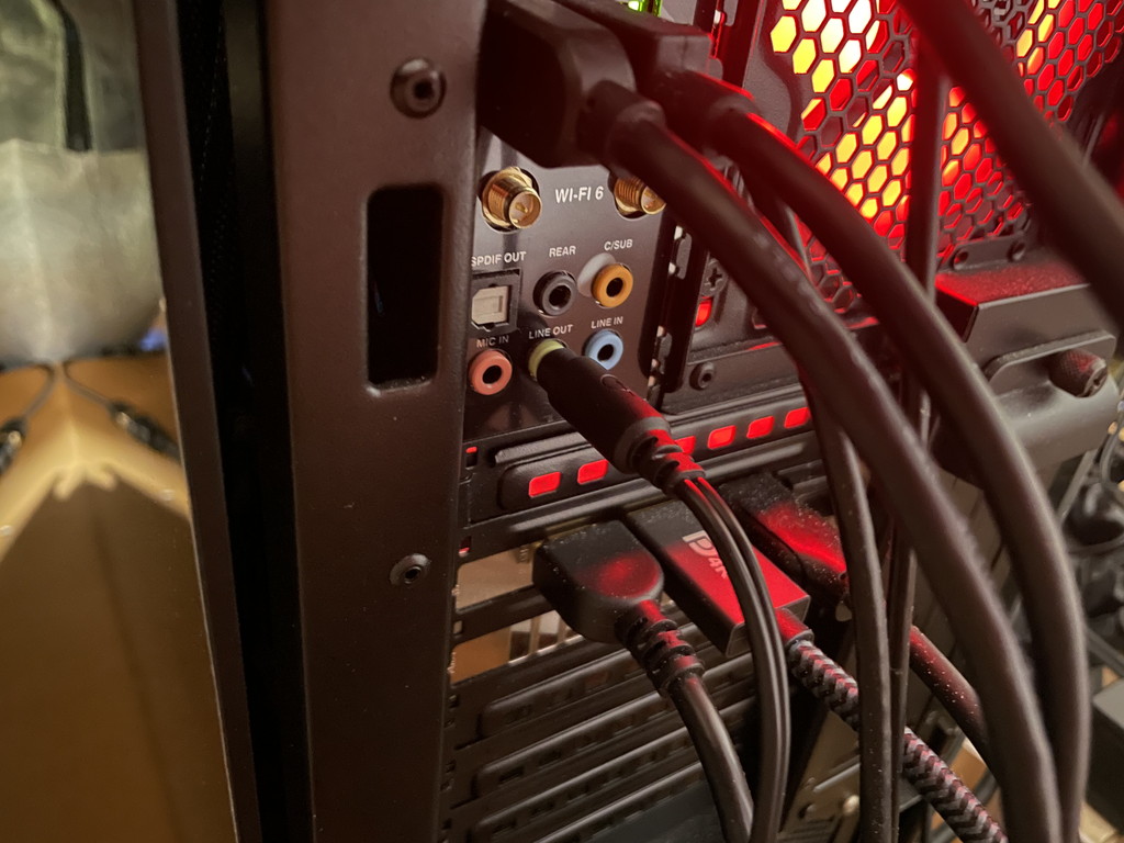 今まで使った事のないマザーボードのサウンド出力にブッ挿します。