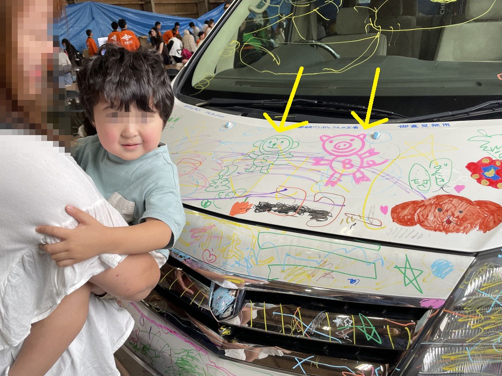 ボンネット中央のブタとサルの絵はウチの奥さん作。