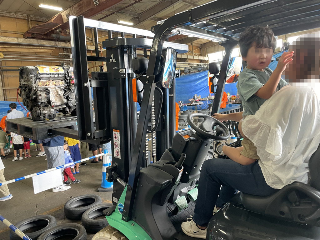 フォークリフト体験コーナーでは200kgくらいのエンジンを実際に持ち上げられます。