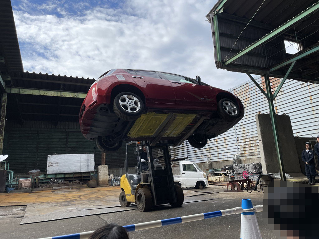 やっちまったぜ!日産!の電気自動車リーフを持ち上げ、下部に搭載されたバッテリーを御開帳。
